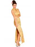This stylish and elegant long Asian gown comes in luxurious cream colored form fitting stretch with earthy toned design patterns.