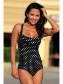 You will look and feel fabulous! - Dipped Neckline Wide Straps, Shelf bra, Double Cross Back Mid Cut Leg Full Rear Coverage Fully Lined Polka Dots Nylon/Lycra fabric